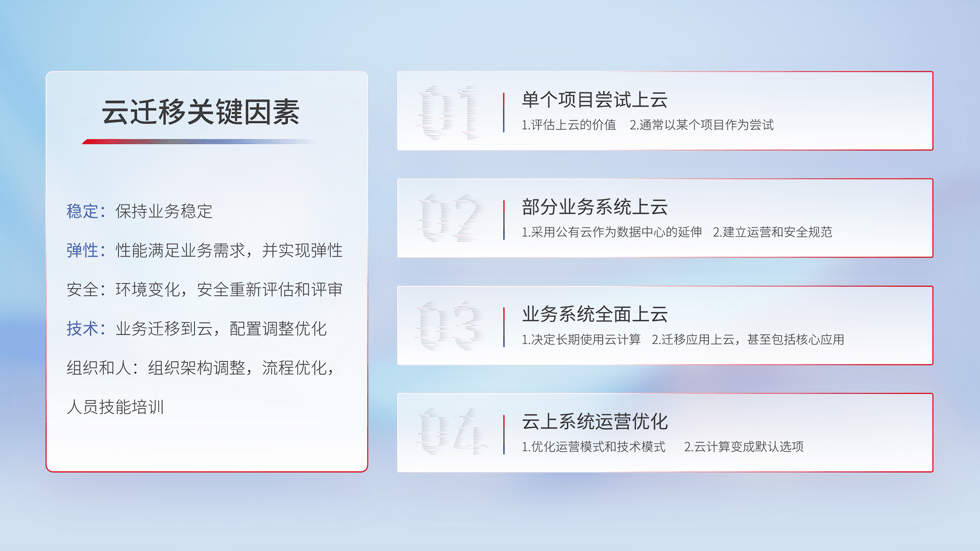 结合实际业务,,,,从规划设计、、、云平台选型、、云原生改造、、、、数据迁移、、集成交付,,,迁移全过程为客户识别最佳上云路径,,,做好风险识别管理,,设计网络架构、、、身份权限、、、、安全审计合规、、、操作审计、、、日志审计、、监控告警策略、、多站点容灾设计等,,对云上基础设施进行整体规划,,,提升IT治理水平,,,以满足弹性、、高可用、、、高性能的需求。。