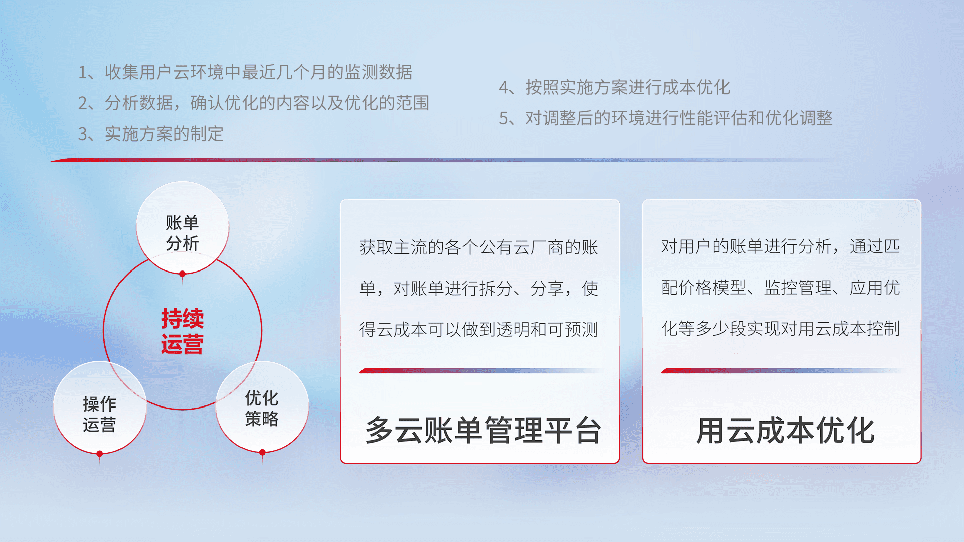 通过多云纳管,,以统一的资源数据模型把客户的云资源进行抽象和封装,,进而实现对多云资源的统一操作,,,保障云资源管理的可靠性、、稳定性与可用性。。量身定制化运维内容,,配置、、、、开发运维、、、、补丁管理、、备份、、、、监控、、、认证和访问管理、、、、审计和日常巡检等,,保障在用云过程中的可靠度,,,稳定度以及高可用率。。